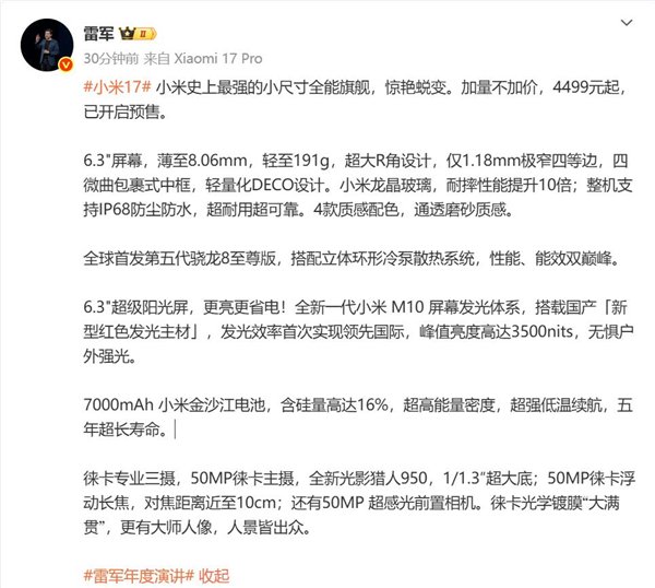 9月26日 信息,小米 创办人雷军 示意,小米17是小米史上最强的小尺寸全能旗舰,惊艳蜕变,加量不加价,4499元起,已开启预售 。