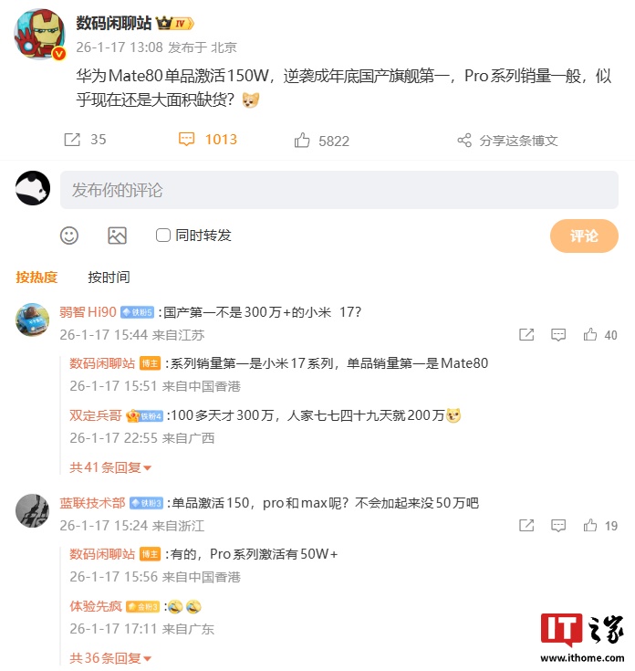 1 月 18 日 信息,博主 @数码闲聊站 昨日发文 透露,华为 Mate 80 单品激活 150W,逆袭成年底国产旗舰第一 。