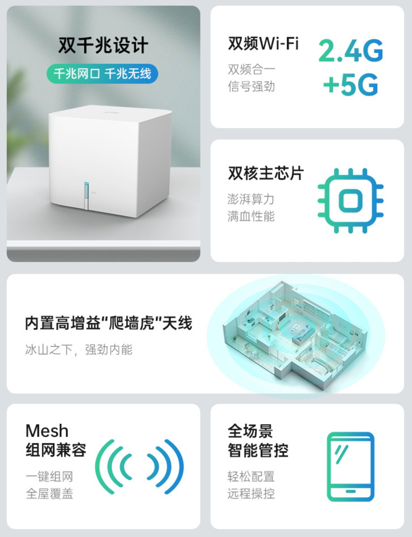 此外,这款 解决器采纳灵动小方糖外观与 潜藏式天线设计,内置自研“爬墙虎”高增益正交互补双频偶极子天线,可通过中兴智慧生活 App 远程治理,2.4G / 5G 双频可分可合,双频合一状况下终端 设施可依据环境智能 取舍更优频段 。