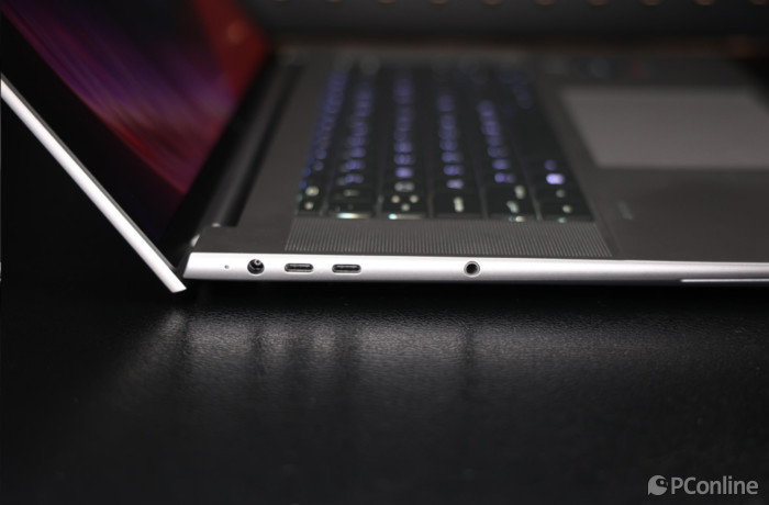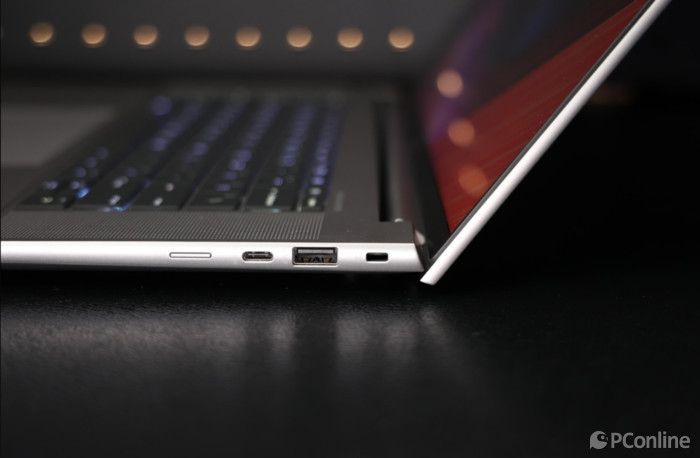 接口方面,左侧 占有1个电源接口、1个耳机/麦克风组合插孔、2个 支撑Thunderbolt4端口,右侧有锁孔、1个USBType-A端口(充电)、1个USBType-C端口、MicroSD卡接口 。 能够轻松满足外界多个 设施的需求 。
