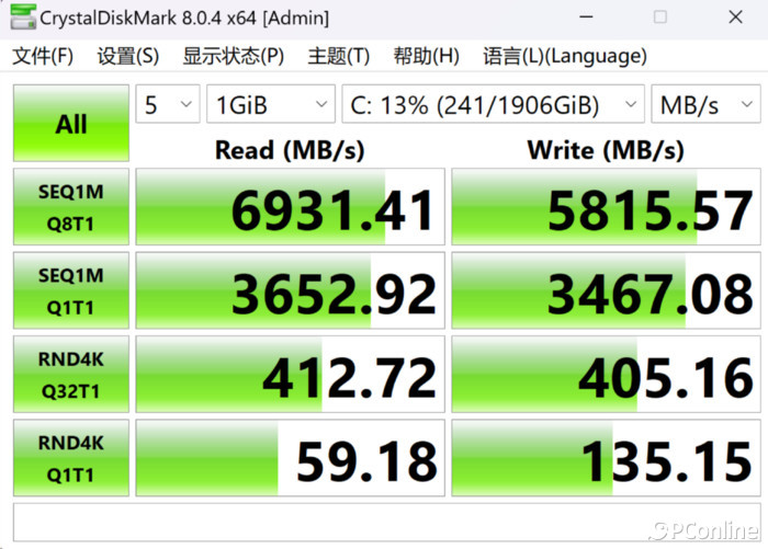 硬盘为铠侠KXG80ZNV2T04,容量为2TBSSD,实测顺序读取速度高达6931MB/s,顺序写入速度5815MB/s, 能够 保障创意工作者大量素材导入/导出的效率 。