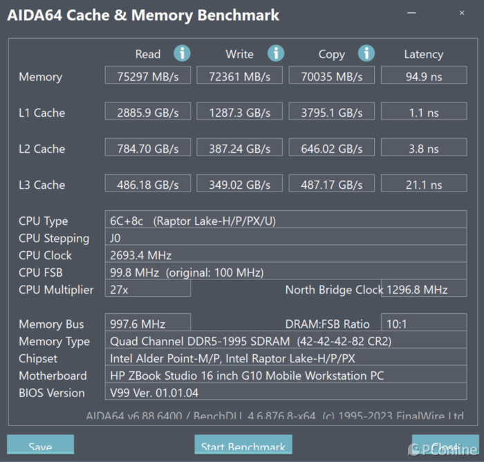 内存方面,它安装了两条16GBDDR5-5200内存构成32GB,通过AIDA64实测,其内存读取速度达到75297MB/s,写入速度72361MB/s,拷贝速度70035MB/s,延迟94.9ns,测试性能 体现 确切不错,在 解决大型文件或载入大型 利用程序时, 能够 保障流畅的 使用体验 。