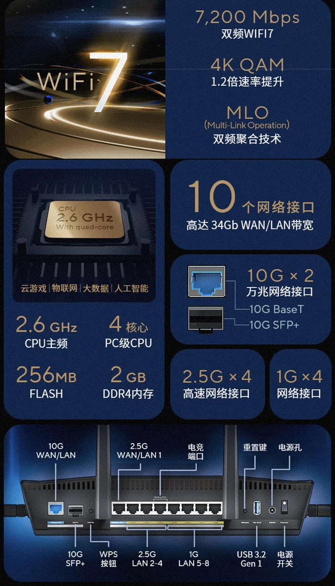 这款路由器提供了 1 个万兆 WAN /?LAN?口和万兆 SFP + 电口、1 个?2.5G WAN /?LAN?口、3 个 2.5G LAN 口、4 个千兆 LAN 口,而前代的 WAN 口与 8 个 LAN 口均为千兆速率 。