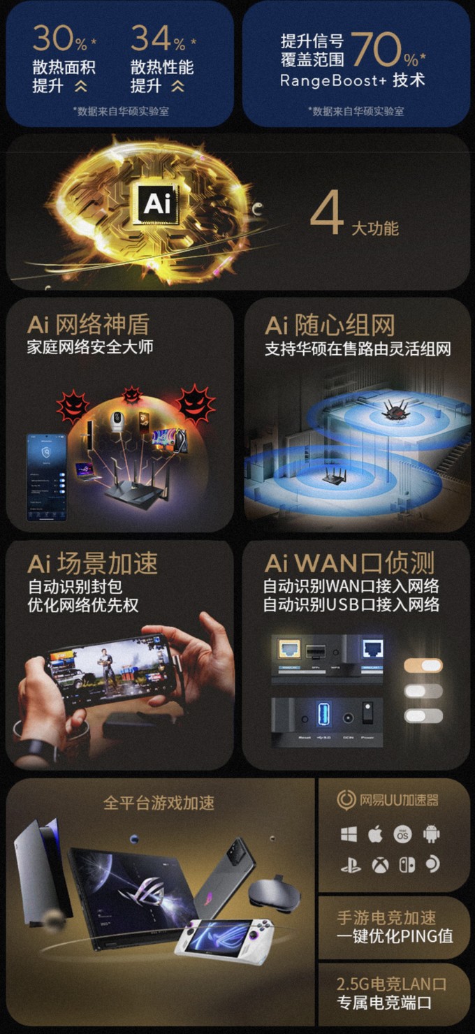 其余方面,这款路由器还采纳了华硕独有的 RangeBoost + 技术、Ai 网络神盾、Ai 随心组网、Ai WAN 口侦测、全平台游戏加快,内置 UU 解决器等 丰盛 性能;提供最长三年质保, 支撑全国联保 。