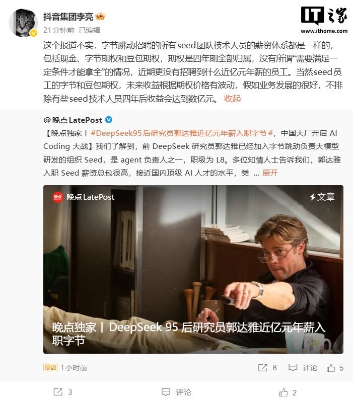 字节近亿元挖来 DeepSeek 核心员工?抖音集团副总裁李亮回应称报道不实