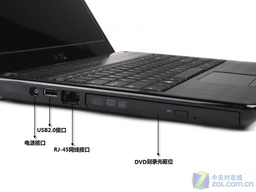 戴尔灵越14v在机身左右两侧提供的都是实用的常见端口,机身左侧的接口从左到右依次是,电源接口、USB2.0接口、RJ-45网线接口和DVD刻录光驱位,而机身右侧安排了常用的音频接口、2×USB2.0接口和VGA外接视频输出端口,由于采用了下沉式转轴机身后侧没有任何接口,作为一款14英寸的笔记本来说,接口种类方面相对表现的平庸了一些。
