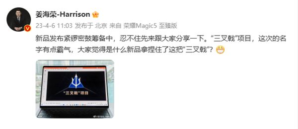 今天, 光荣CMO姜海荣 透露, 光荣新款MagicBook 14笔记本马上公布,代号为“三叉戟” 。