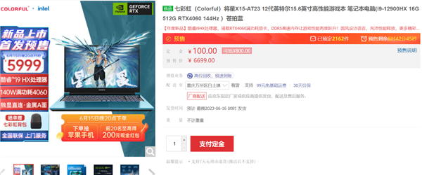 在618品牌日大促返场 运动中,七彩虹推出的将星X15 AT新品面市, 提议报价6699元,100元定金可折抵800元,首发到手 只有5999元,晒单还送七彩虹背包 。