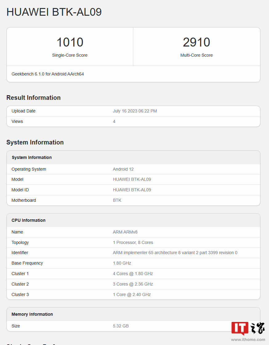 IT之家发现,现有一款型号为 BTK-AL09 的华为平板电脑新品浮现在了 Geekbench 基准测试平台上 。对此,博主 @那片梧桐那片雨 示意这是新款 MatePad 2023 平板的 LTE 版本 。