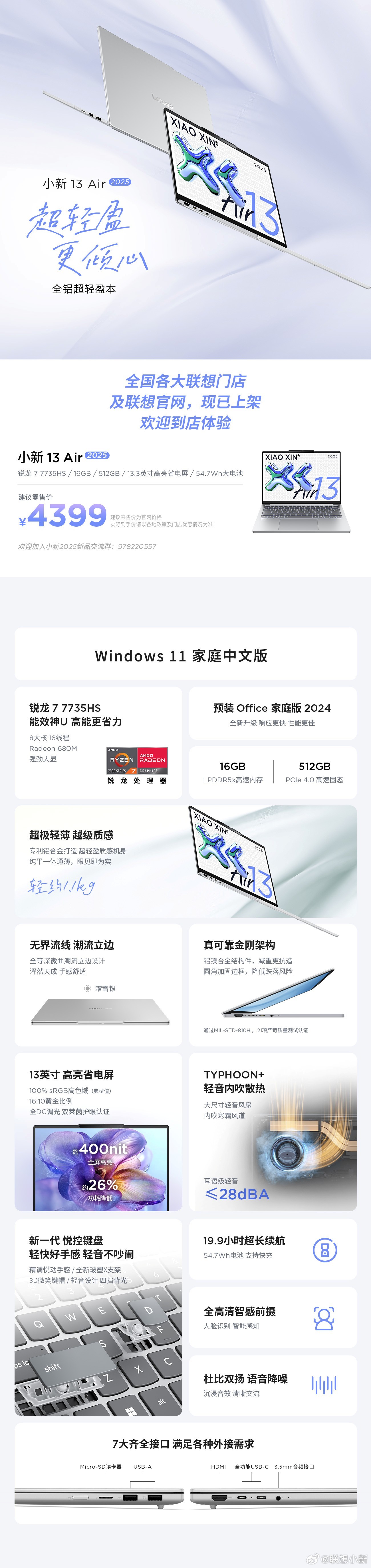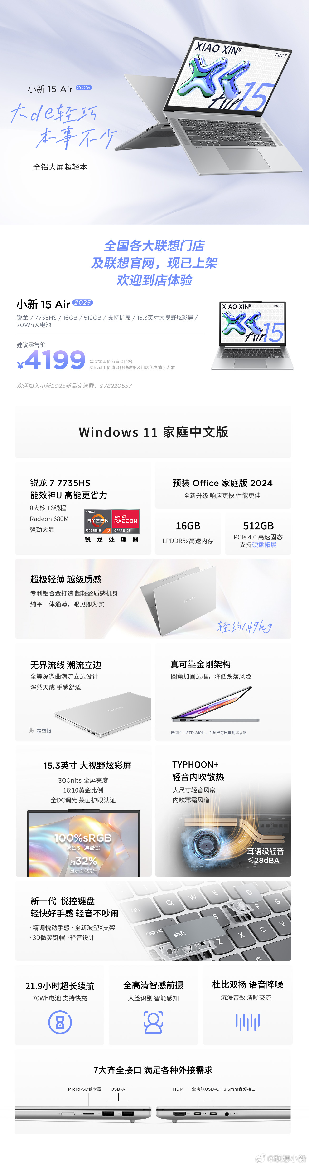 联想小新 13/15 Air 2025 全铝超轻盈本发布,4199 元起 |