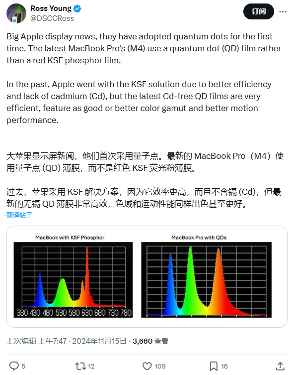 11 月 15 日 信息,Ross Young 发现,苹果新推出的 2024 款?MacBook Pro 采纳量子点显示技术 。