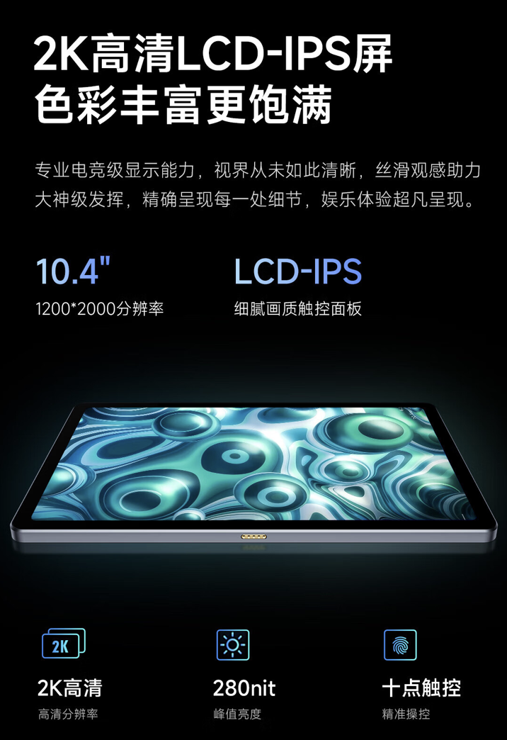 官方介绍称,系列平板电脑装备联发科 MT8791 解决器,搭载 10.4 英寸?2K LCD?屏(1200 x 2000?分辩率),屏幕峰值亮度?280?尼特 。