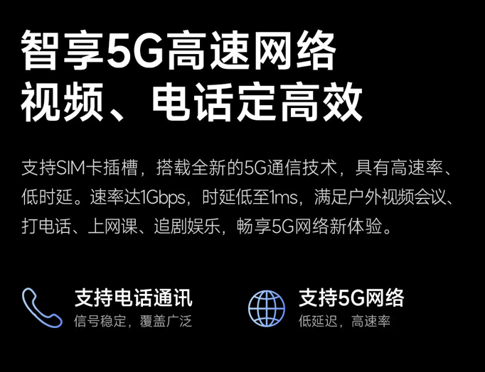 系列平板 支撑?5G?蜂窝网络, 支撑拨打电话,网速至高 1Gbps,时延 1ms,号称可满足户外多人视频会议需要 。