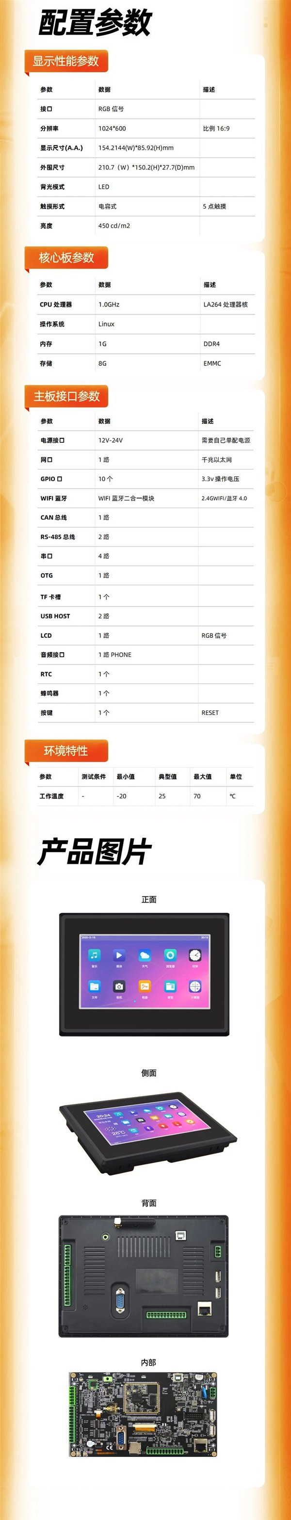 显示屏 支撑电容式5点无盲点触摸,LED背光,分辩率1024x600,亮度450nits 。