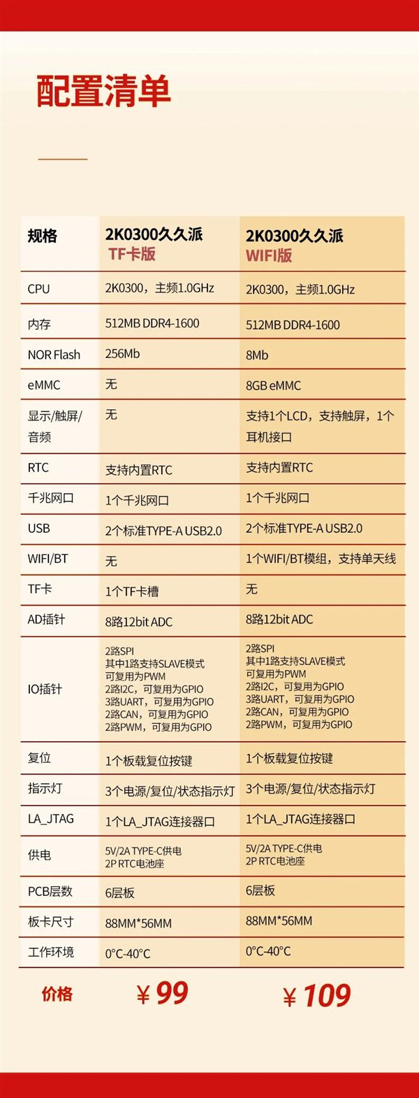 在此之前,龙芯中科还推出了同样基于龙芯2K0300 解决器的龙芯派-新生99元派 2K0300久久派,包含99元的TF卡版、109元的Wi-Fi无线版 。