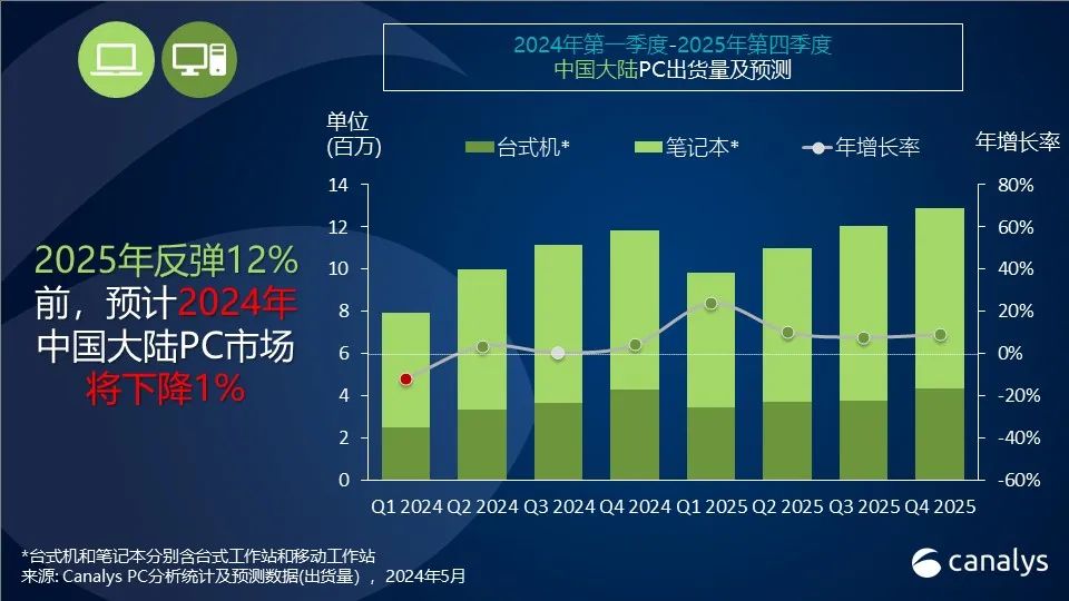 6 月 18 日 信息,市场 考查机构 Canalys 发布最新报告,预估 2024 年中国大陆个人电脑(含台式机、笔记本和工作站)市场估计会缩减 1%,不过会在 2025 年迎来 12% 的反弹 。