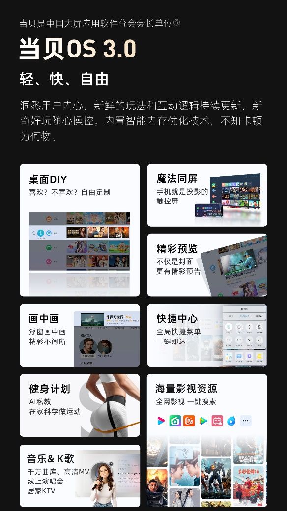 作为当贝X3家族系列新品,当贝X3Air连续了以前的当贝OS3.0系统 。“轻、快、 自由”的系统理念和丝滑流畅的运行速度让当贝在投影系统中 自成一家 。针对家用激光投影仪,当贝深耕该领域多年,堪称家用激光投影第一,如今更是推进激光投影进入4000元新时代,为激光投影市场的进展与 遍及提供了 壮大助力 。当贝作为家用投影行业的头部品牌,始终以推进行业改造为己任,其产品当贝X3 获得行业媒体和权威平台的广受 赞美,而当贝X3系列在家用激光投影仪市场份额里更是占领了超一半份额, 象征着每卖出2台激光投影,就有1台是当贝,当贝X3Air在先前的 根底上也是带来了更新的进展 。