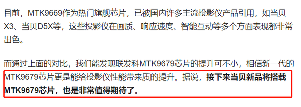 因为被挡住了一只角,我这边看 形容文字,暂且推测为AI智能 。不过,假如采纳的是新芯片MTK9679,大约当贝投影新品的自动对焦、自动梯形 校 平等智能 性能都会更迅速、更精准、更智能化 。