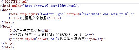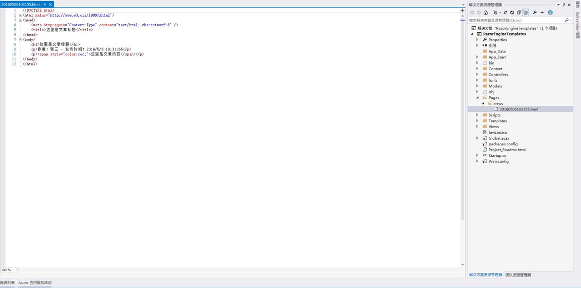 二、我们新建一个Razor的Html模板 <!DOCTYPE html> <html xmlns="http://www.w3.org/1999/xhtml"> <head> <meta http-equiv="Content-Type" content="text/html; charset=utf-8"/> <title>@Model.Title</title> </head> <body> <h1>@Model.Title</h1> <p>作者:@Model.Author - 发布时间:@Model.CreateDate</p> <p>@Raw(Model.Content)</p> </body> </html> 说明:Model就是我们的文章实体类 在MVC的试图页cshtml中 我们一般都是在控制器里传递这个实体类 然后在视图页中 @model Models.Articles 来接收这个实体类 然后通过“@Model.”来输出内容,在Razor模板中是一样的,只是不用@model Models.Articles 来接收了,其它的语法跟在.cshtml试图页中是一样的,这么说多余了,因为写法不一样他就不是Razor了 三、我们写一个方法来获取模板页的Html代码