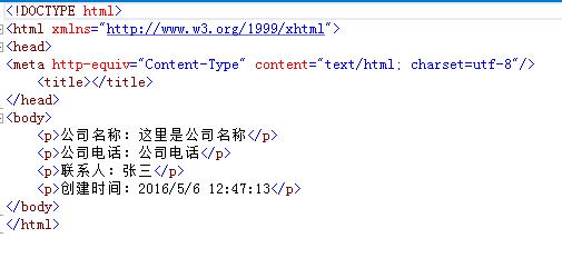 <!DOCTYPE html> <html xmlns="http://www.w3.org/1999/xhtml"> <head> <meta http-equiv="Content-Type" content="text/html; charset=utf-8" /> <title>@Model.Title</title> </head> <body> <h1>@Model.Title</h1> <p>作者:@Model.Author - 发布时间:@Model.CreateDate</p> <p>@Raw(Model.Content)</p> </body> </html> <!DOCTYPE html> <html xmlns="http://www.w3.org/1999/xhtml"> <head> <meta http-equiv="Content-Type" content="text/html; charset=utf-8"/> <title></title> </head> <body> <p>公司名称:@Model.CompanyName</p> <p>公司电话:@Model.CompanyTel</p> <p>联系人:@Model.ContectUser</p> <p>创建时间:@Model.CreateDate</p> </body> </html>