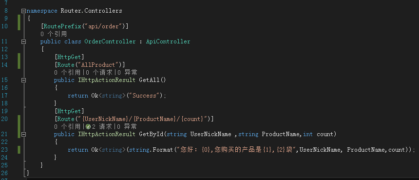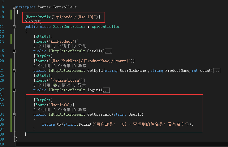这样很明显是比较麻烦的 。所以我们用[RoutePrefix]属性来设置一个公共的前缀