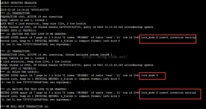 发现session 2的insert成功,而session3检测到死锁回滚 session 2 Query OK, 1 row affected (28.87 sec) session 3 ERROR 1213 (40001): Deadlock found when trying to get lock; try restarting transaction 死锁原因分析: 首先session1插入一条记录,获得该记录的排它锁,这时session2和session3都检测到了主键冲突错误,但是由于session1并没有提交,所以session1并不算插入成功,于是它并不能直接报错吧,于是session2和session3都申请了该记录的共享锁,这时还没获取到共享锁,处于等待队列中 。这时session1 rollback了,也就释放了该行记录的排它锁,那么session2和session3都获取了该行上的共享锁 。而session2和session3想要插入记录,必须获取排它锁,但由于他们自己都拥有了共享锁,于是永远无法获取到排它锁,于是死锁就发生了 。如果这时session1是commit而不是rollback的话,那么session2和session3都直接报错主键冲突错误 。查看死锁日志也是一目了然