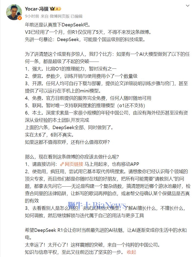 《黑悟空》制作人冯骥评DeepSeek:可能是个国运级别的科技成果