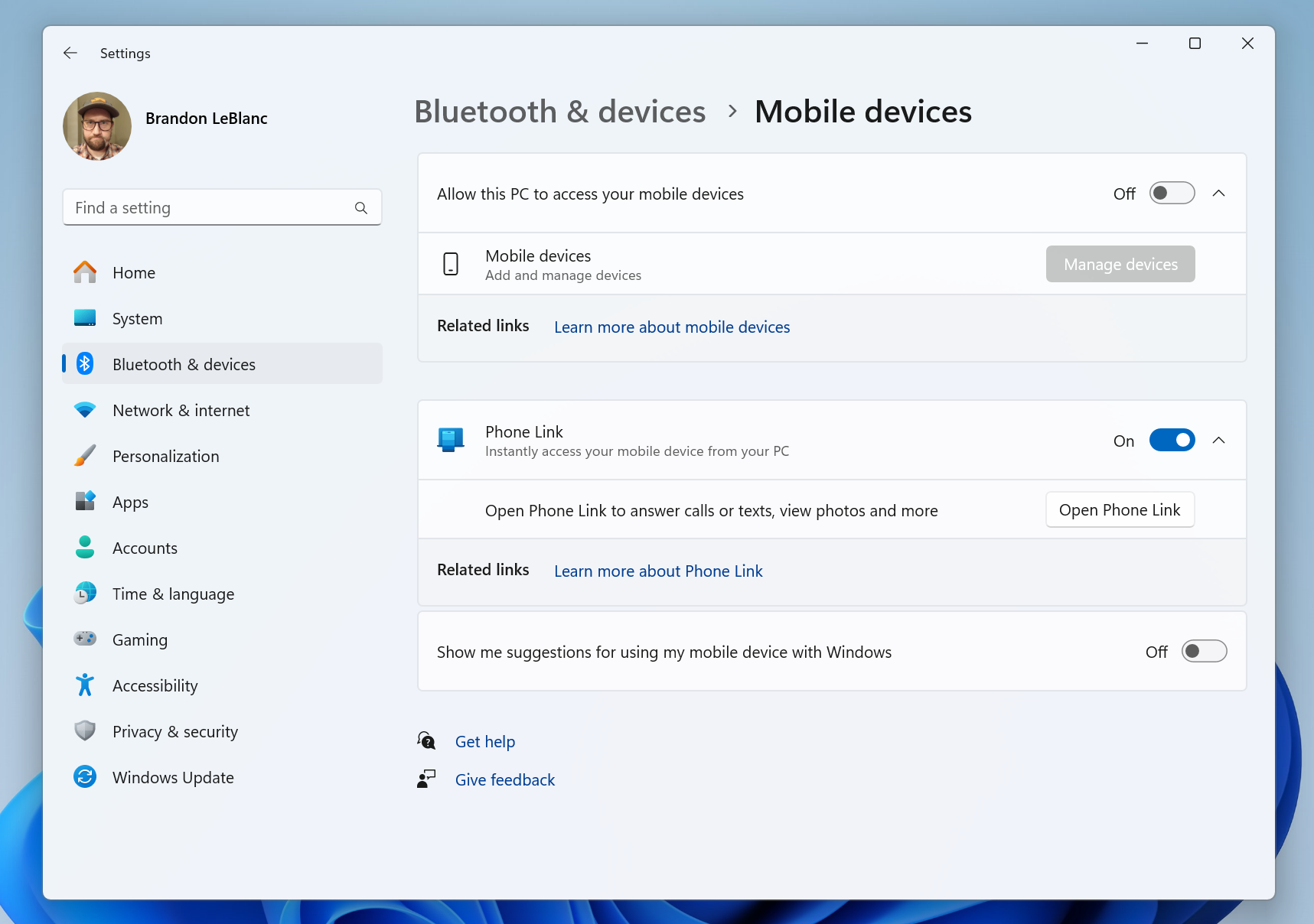 新增 性能:将“蓝牙和 设施”>“电话链接”设置页面重命名为“移动 设施” 。