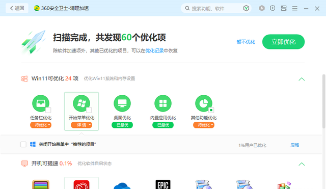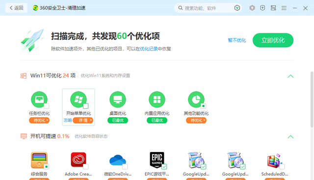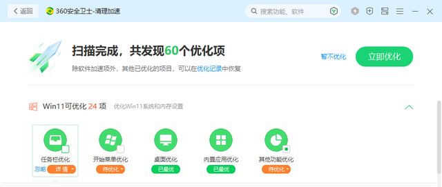 打开Win11优化 性能后,扫描过程仅需几十秒 。以我们这台测试机系统为例,因为该系统是第一次运行此 性能,我们 能够看到可优化项还是蛮多的 。由此可见,首次 使用消费者或长期未清理优化的消费者,360安全卫士极速版 能够对此进行深度的清理和加快的 。