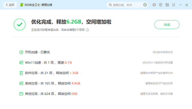 待 所有优化 顺利后,360安全卫士极速版会直接 揭示 开释空间以及清理加快的细则 。新版优化 后果页将Win 11加快、软件垃圾清理、系统垃圾清理及 其余垃圾清理进行分类显示,清理 后果 详尽且直观,也大幅优化了消费者的 使用体验 。