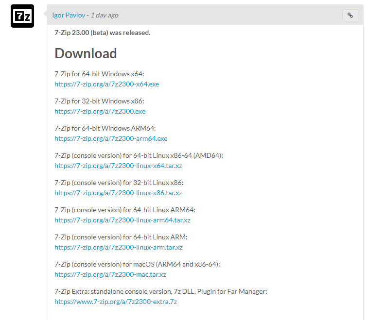 7-Zip 方才推出了崭新的 23.00(测试版),而上一次更新还是在 2022 年 7 月 15 日公布的 22.01 版本 。