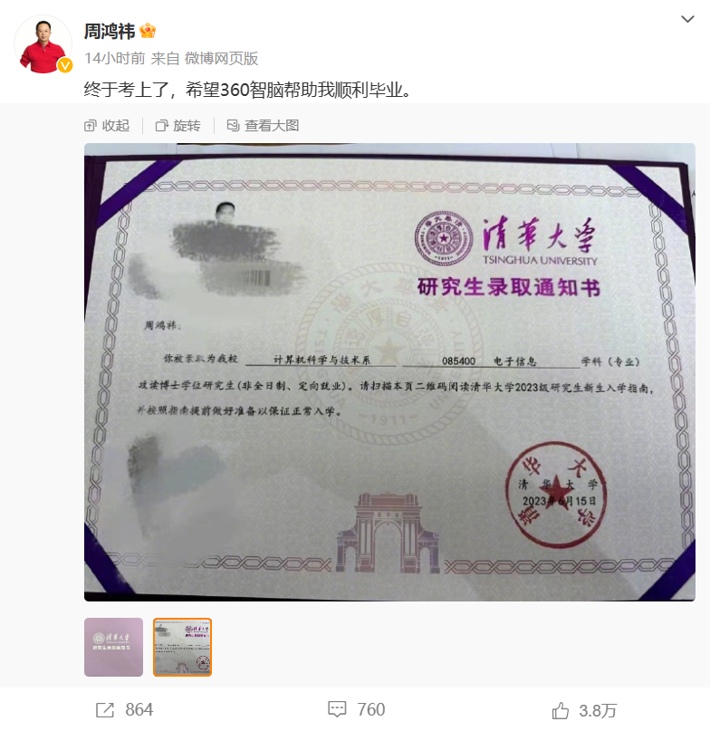 IT之家此前报导,周鸿祎今年 6 月被清华大学计算机科学与技术系电子信息专业录取,攻读非全日制、定向 待业博士探究生 。