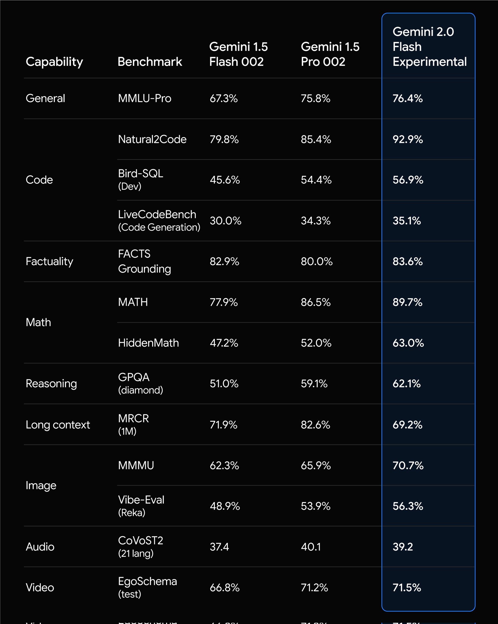 如图所示,?Gemini 2.0 在 要害基准测试中 有关于?Gemini?1.5 Pro 实现了大幅性能 晋升,谷歌官方的表述是“在 要害基准测试中的 体现优于 1.5 Pro 两倍” 。