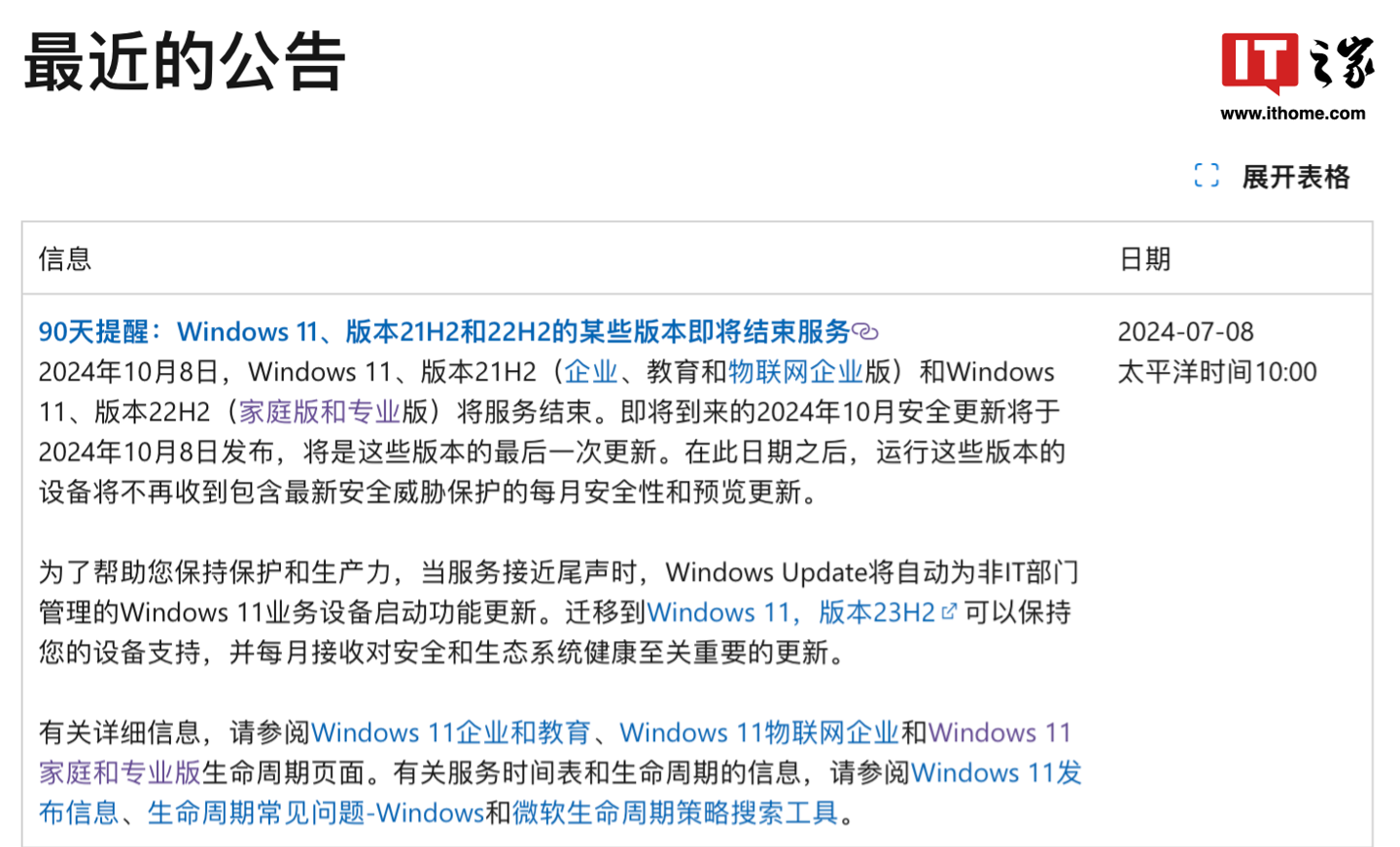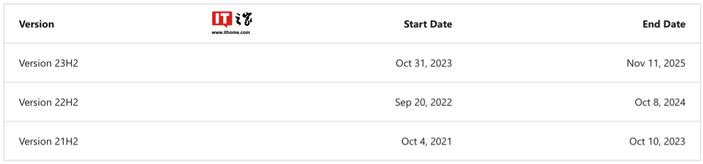 IT之家 查问微软?Windows?生命周期文档获悉,当前 Windows 11 主流版本 23H2?将于?2025 年 11 月 11 日 结束,而微软还未将?24H2?增加到 有关文档中 。