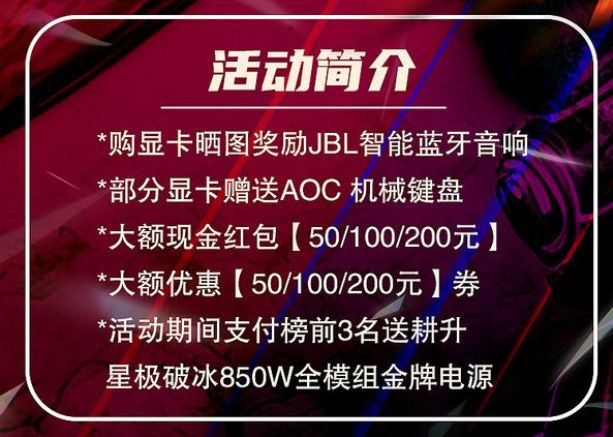 第三,大额现金红包等你来抢!消费者将 获得耕升送出的50/100/200元大额现金红包 嘉奖,数量有限,先到先得 。