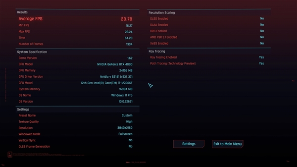 经实测,在原生4K画质下开启《赛博朋克2077》的超速光追模式,假如不开启DLSS等辅助,游戏的 均匀帧率仅有20.78 。