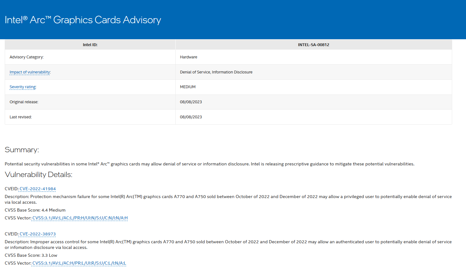 8 月 13 日 信息,英特尔官网近日公布布告,披露了一个代号为 INTEL-SA-00812 的 漏洞,将波及上一年 10 月-12 月期间售出的 部分锐炬 A770 / A750 显卡 。