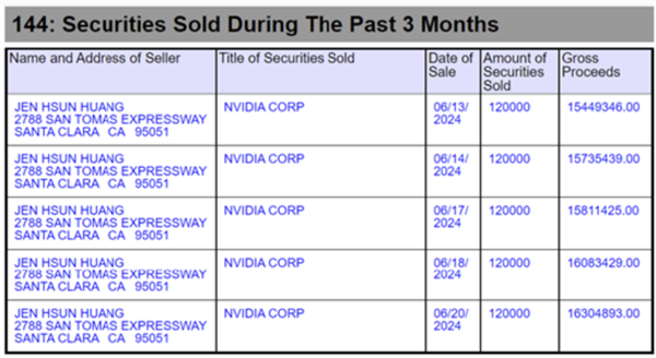 具体来看,黄仁勋在本地 工夫6月13日、6月14日、6月17日、6月18日、6月20日分别 销售了12万股英伟达的股票,此外还有12万股待 销售中 。