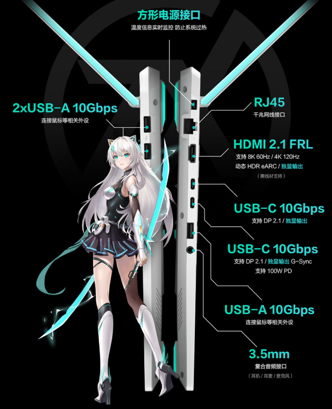 华硕天选6 Pro 锐龙版模具全面焕新,外观继承家族式机甲美学设计 格调,融入不对称斜切设计,搭配独家魔幻青配色,辨识度极高;轻约2.25kg,薄至1.79cm的轻量化机身设计也进一步 晋升了便携性 。接口方面,装备2 × USB-C 10Gbps( 支撑DP2.1)、3 × USB-A 10Gbps、HDMI2.1 FRL、RJ45千兆网口、3.5mm复合音频接口,可轻松满足多 设施协同工作及外设拓展衔接需要 。