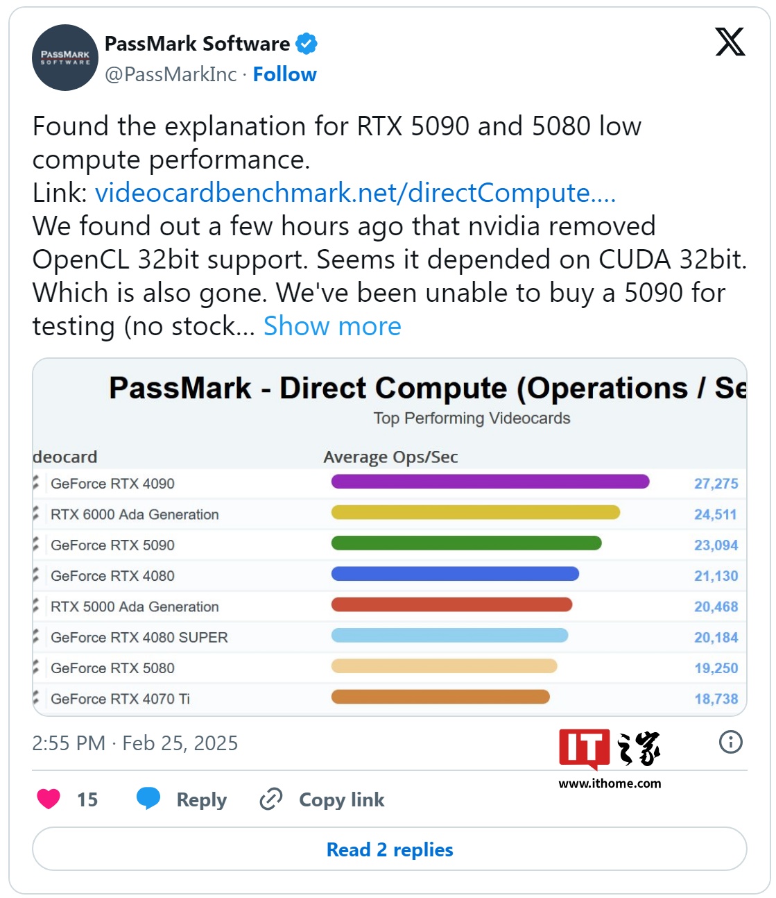 PassMark 揭示英伟达 RTX 50 系列显卡性能问题根源:弃用 32 位 OpenCL 和 CUDA 支持 |