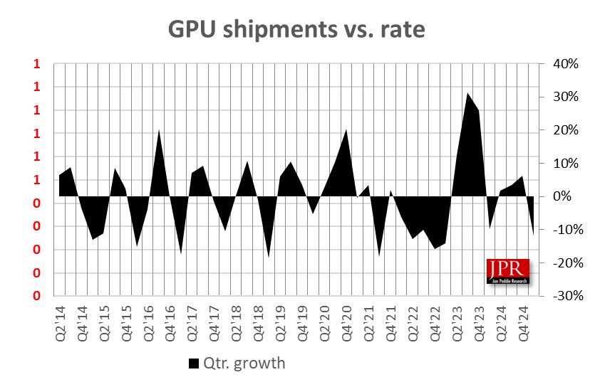 JPR 报告 2025Q1 全球 PC GPU 出货量 6880 万块:同比下降 1.6%、环比下降 12% |