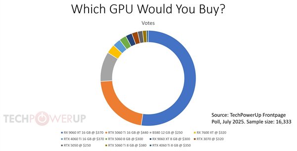 TechPowerUp在其网站上 发动了一项对于显卡购买 志愿的读者 考查,累计收到16333份有效问卷, 后果显示AMD RX 9060 XT 16GB以绝对优势成为最受 欢送的 取舍 。