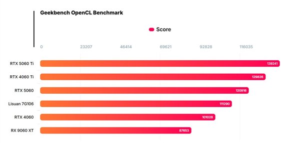 砺算7G106 GPU的显卡在测试台上运行,Geekbench OpenCL测试111,290分,超过英伟达RTX 4060的101,028分;FireStrike跑分26800分, 几乎追平RTX 4060的27000-28000分 。
