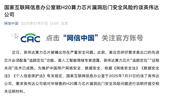 【TechWeb】8月1日 信息,据“网信中国”微信公众号 信息,近日,英伟达算力芯片被曝出存在严峻安全问题 。7月31日,国家互联网信息办公室约谈了英伟达公司,要求英伟达公司就对华销售的H20算力芯片 漏洞后门安全风险问题进行 注明并提交 有关 证实 材料 。