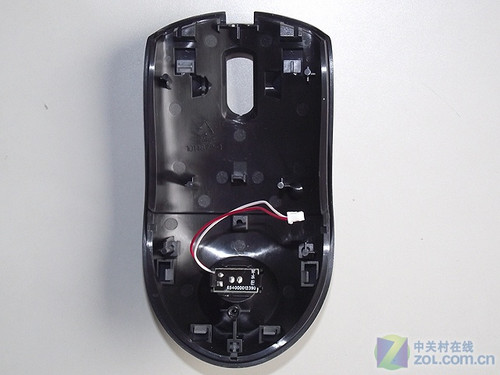 将Razer镜面版地狱狂蛇中壳翻过来,就可以看到发光LOGO的主要原件,一个乳白色的高亮LED被黑色的PCB板固定在黑色的聚光碗中。不过PCB上极其简洁,除了一个LED以外别无长物,另外PCB板的尺寸也极小,玩家如果想自己改个呼吸灯什么的,只能再外加电路板了。