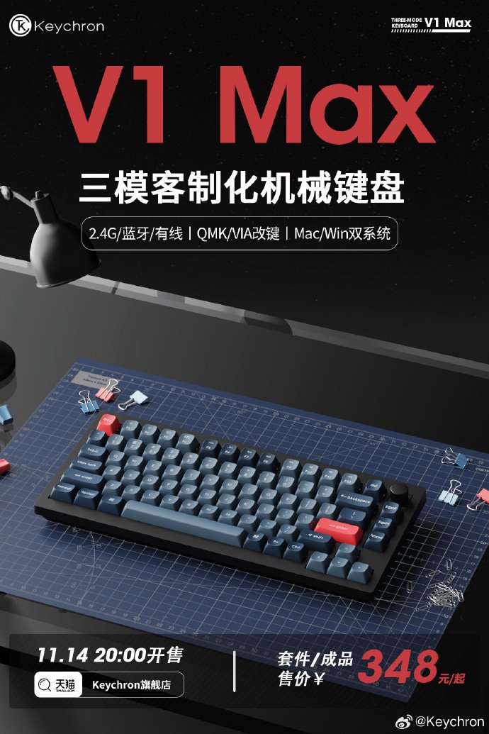 11 月 14 日 信息,Keychron 今天推出新款 V1 Max 三模机械键,报价 348 元起,今晚 8 点上架 。