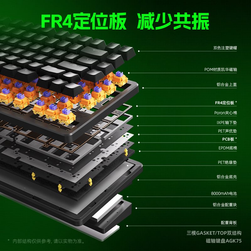此外,蚂蚁电竞 AGK75 机械键盘装备五层消音填充,消费者可在 GASKET 和 TOP 中 取舍更 合适 本 本领感的 构造 。