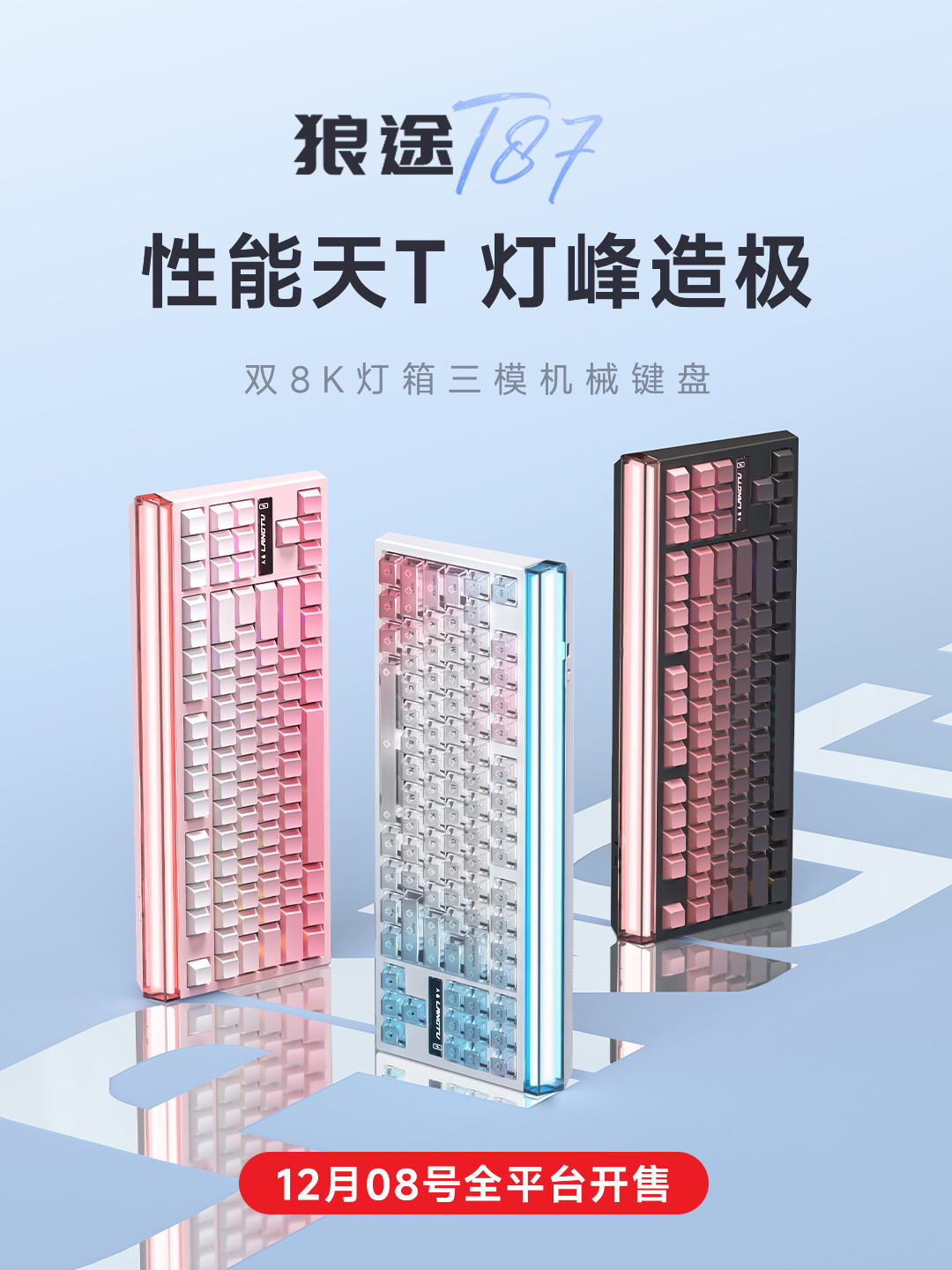狼途推出 T87 系列 ARGB 灯箱三模机械键盘:12000mAh 电池,可选 8kHz 版 |