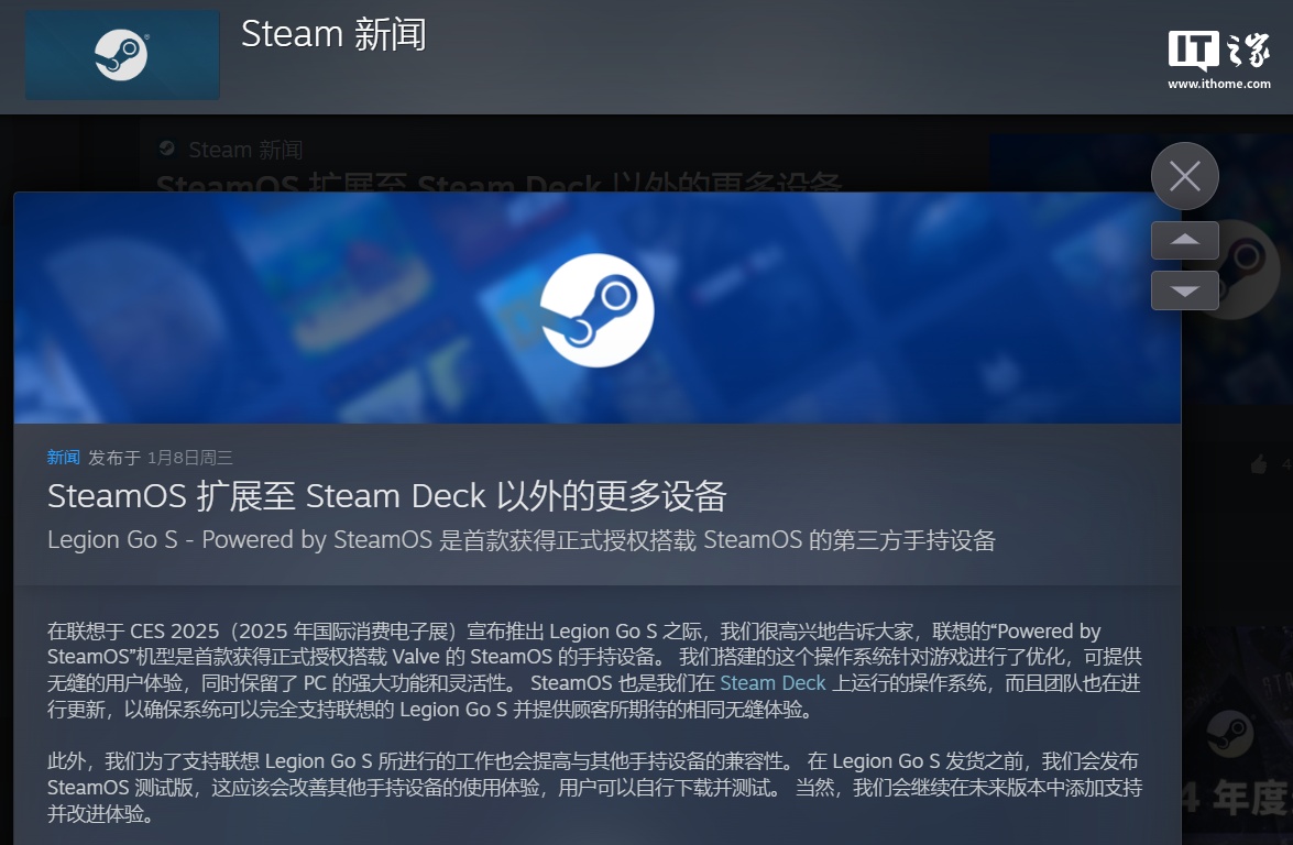 1 月 8 日 信息,据 Steam 官方新闻 核心 信息,SteamOS 将 扩充至 Steam Deck 以外的更多 设施 。在 CES 2025 上亮相的联想?Legion Go S 掌机是首款 获得正式授权搭载 Valve 的 SteamOS 的第三方手持 设施 。