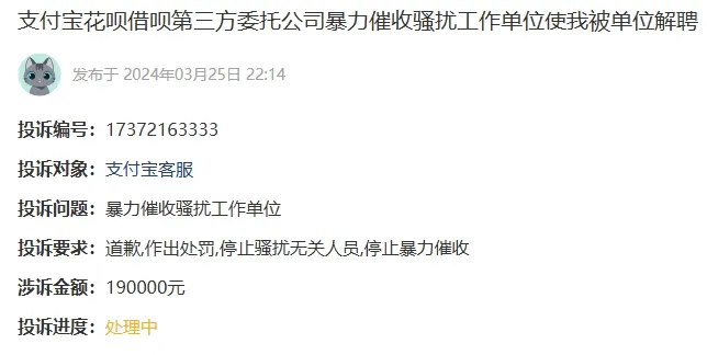 更有甚者,花呗、借呗的第三方托付公司暴力催收招致欠款人被单位解聘 。